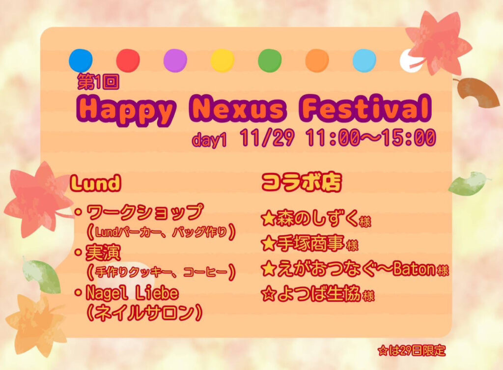 .☆゜第1回 Happy Nexus Festival.☆゜ ひなたcafé Lundと地域企業のコラボ企画!!! 日時 11月29日(土) 11:00〜15:00 場所 Le Bois (1F 飲食スペース 2F ワークショップ&ネイルサロン) 当日は自習室も解放します。場所は放課後デイサービスLundです(塾から徒歩2分)。 ※今回は現金でやりとりを行います!お小遣いをご用意ください👛 人数把握の為、参加される人数とお名前のご連絡をお願いいたします🙇♀️ ※ご家族、お友達のご参加も大歓迎です😊