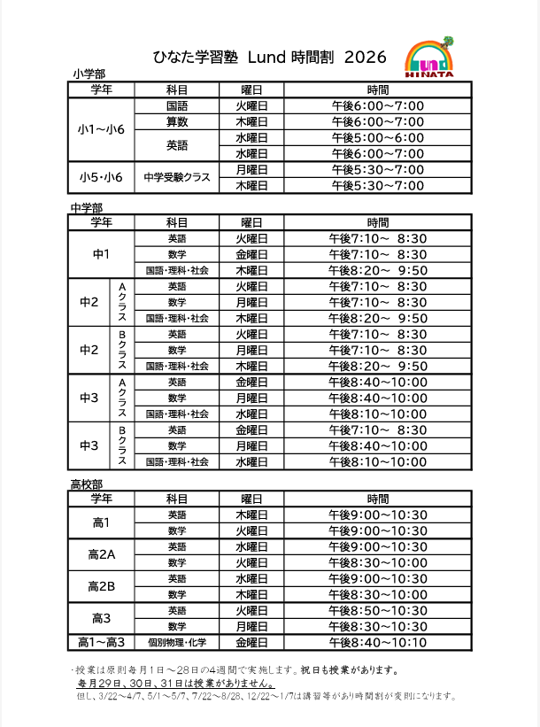 ひなた学習塾Lundの2026年4月8日からの時間割ができました!
